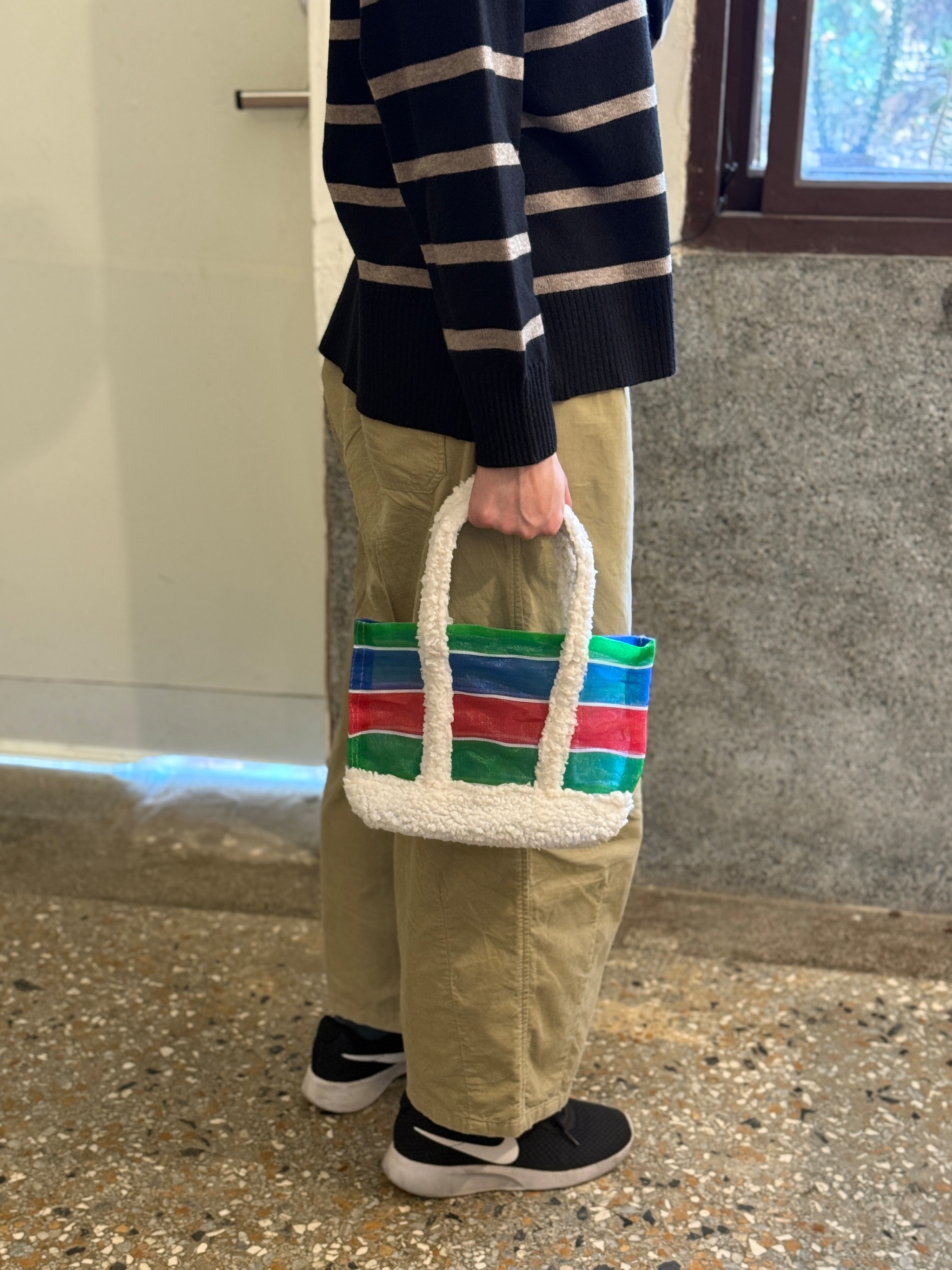 台湾土産でおなじみの「漁師網バッグ(1号サイズ)」が、モコモコの持ち手と出会って、こんなに優しく、愛らしい表情に生まれ変わりました✨