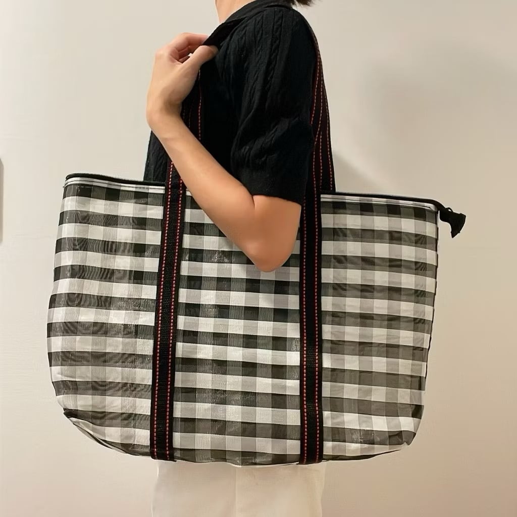 ファスナー付きギンガムチェック柄漁師網特大お買い物バッグ