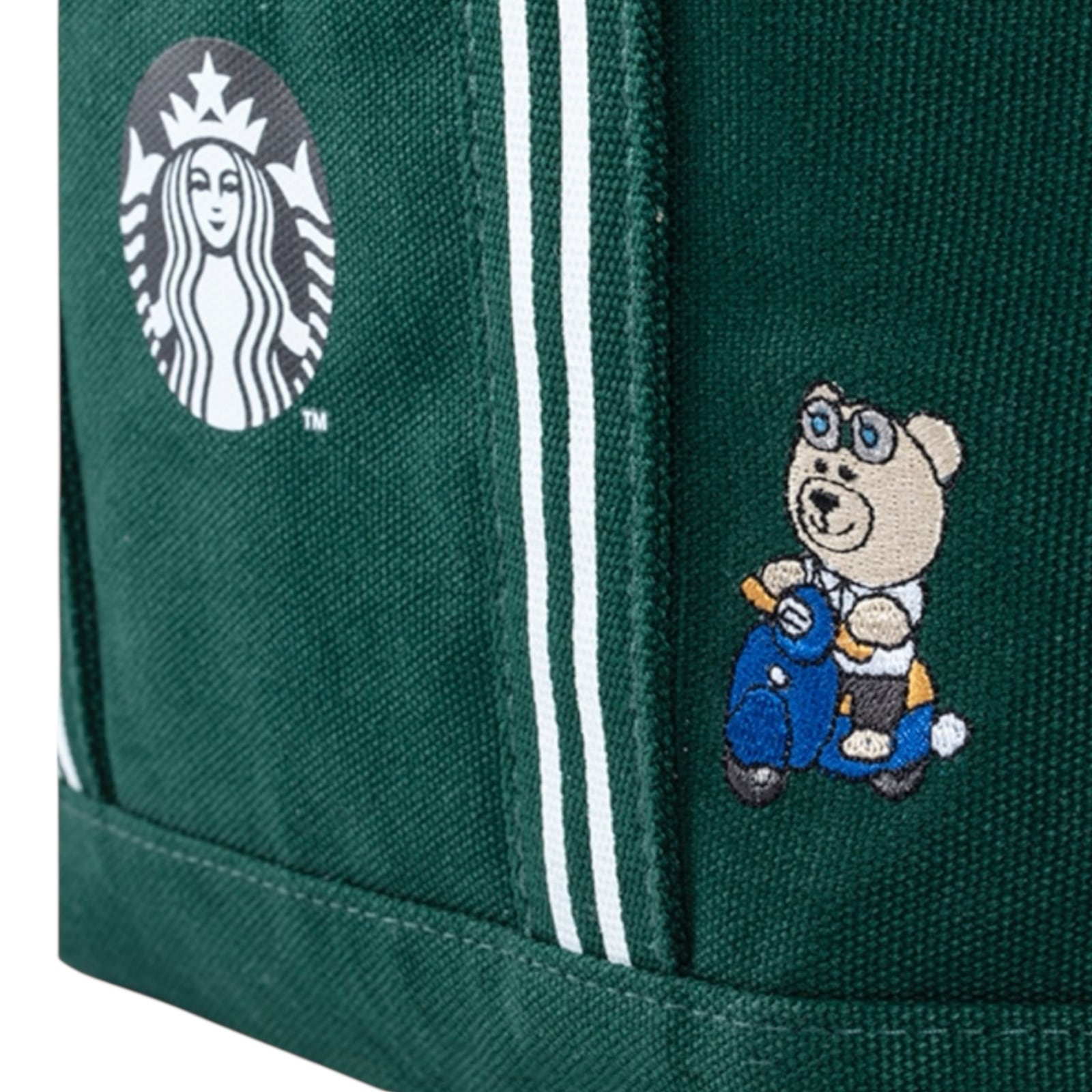 深みのあるスターバックスグリーンに、ベアリスタの愛らしい刺繍をあしらった、大人かわいいトートバッグです。