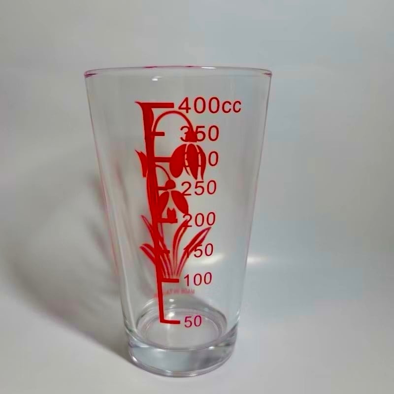 どっしりとした重みがあり、100mlごとに数字が書いてあるので計量グラスとしてもお使いいただけます。