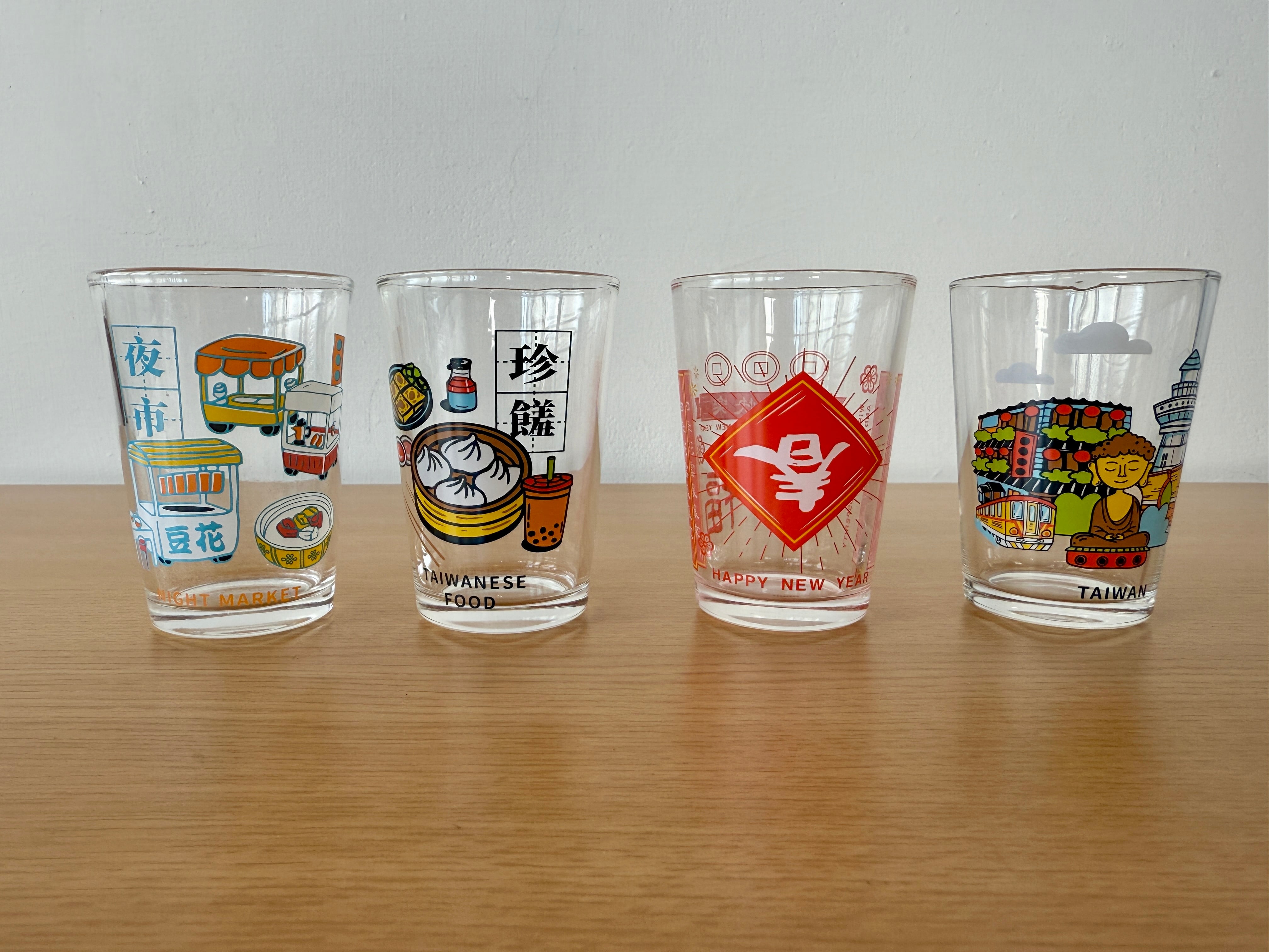 台湾の日常や縁起モチーフをポップなイラストで描いた、台湾紀念ビアグラス。