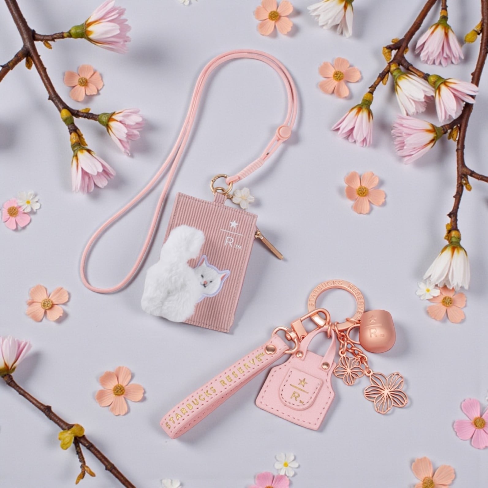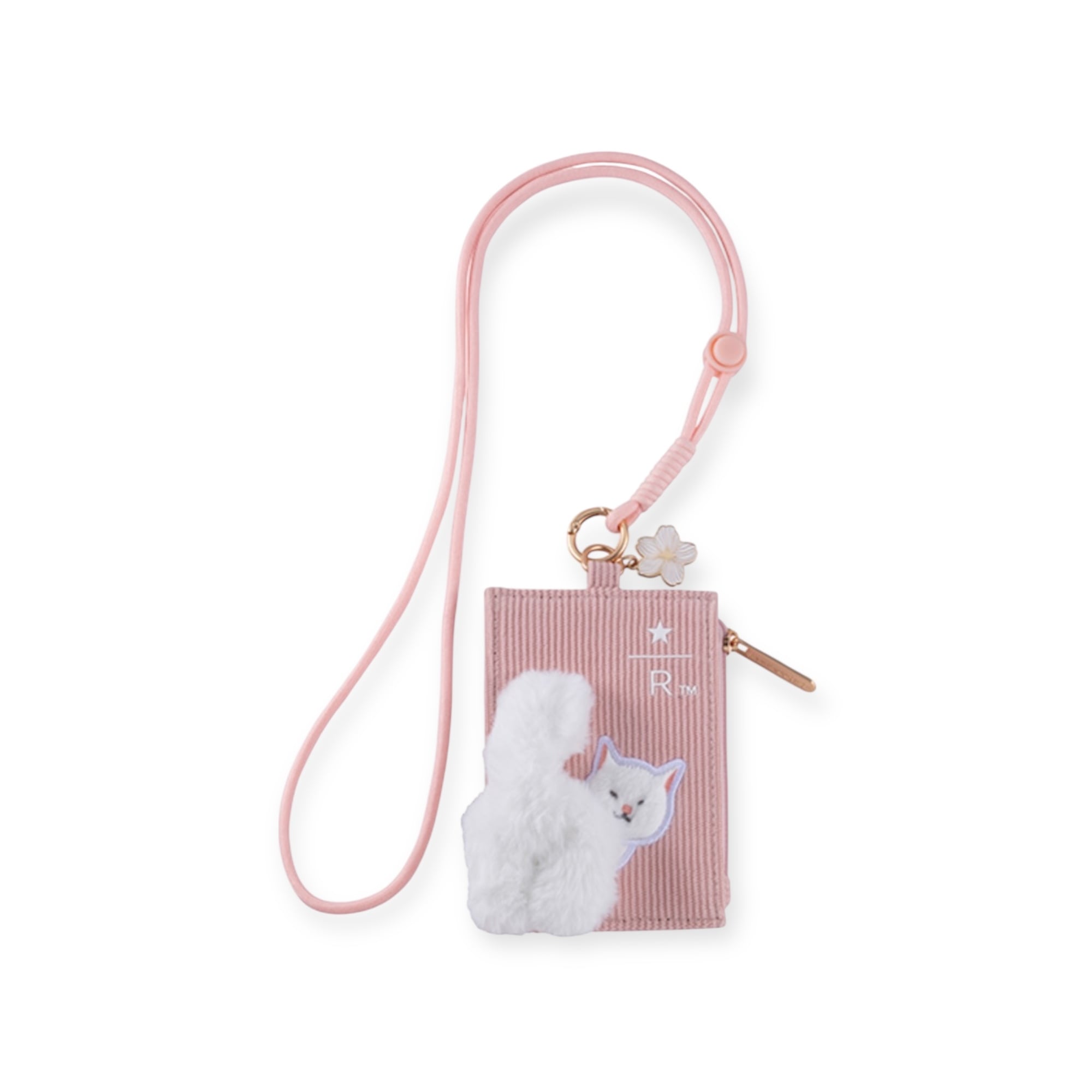 淡いピンクを基調に、ふわふわの白猫チャームが寄り添う癒し系デザイン。